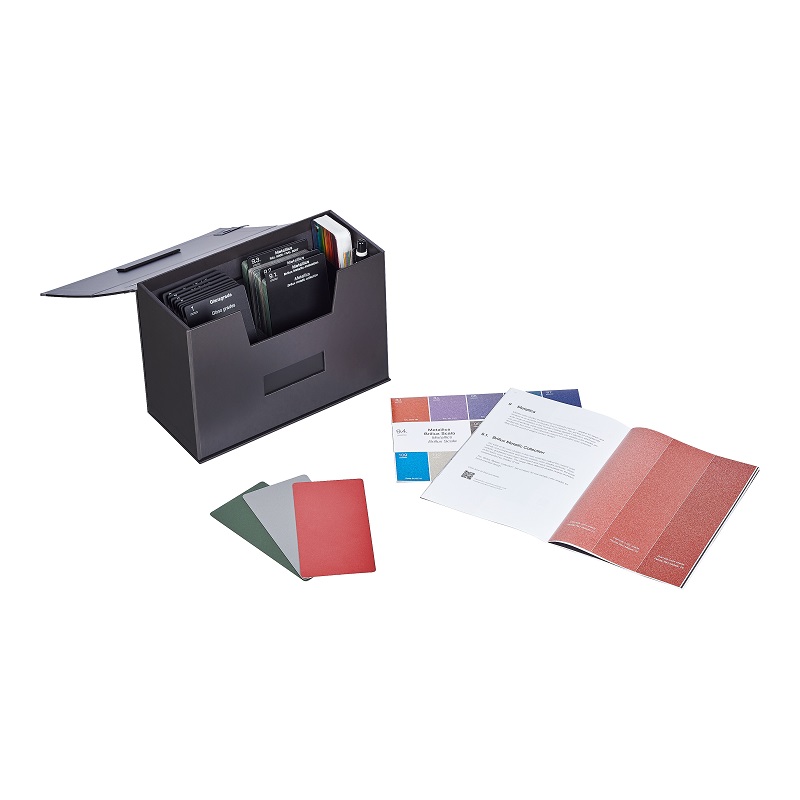 Zu den Highlights der Musterkollektion zählen neben der trendigen, strukturierten Wrinkle-Optik und neun attraktiven Eloxal-Farbtönen in Pulverlackausführung die neu entwickelten Brillux Metallics insbesondere für Anwendungen in Architektur- und Interior Design. Gleich 30 abgestufte Metallic-Farbtöne, basierend auf zehn beliebten klassischen und aktuell stark nachgefragten Grundfarbtönen aus dem Grau-, Braun- und Rotspektrum, wurden neu rezeptiert. Sie erweitern den Gestaltungsspielraum für Fassadenelemente oder Möbel und Leuchten enorm.